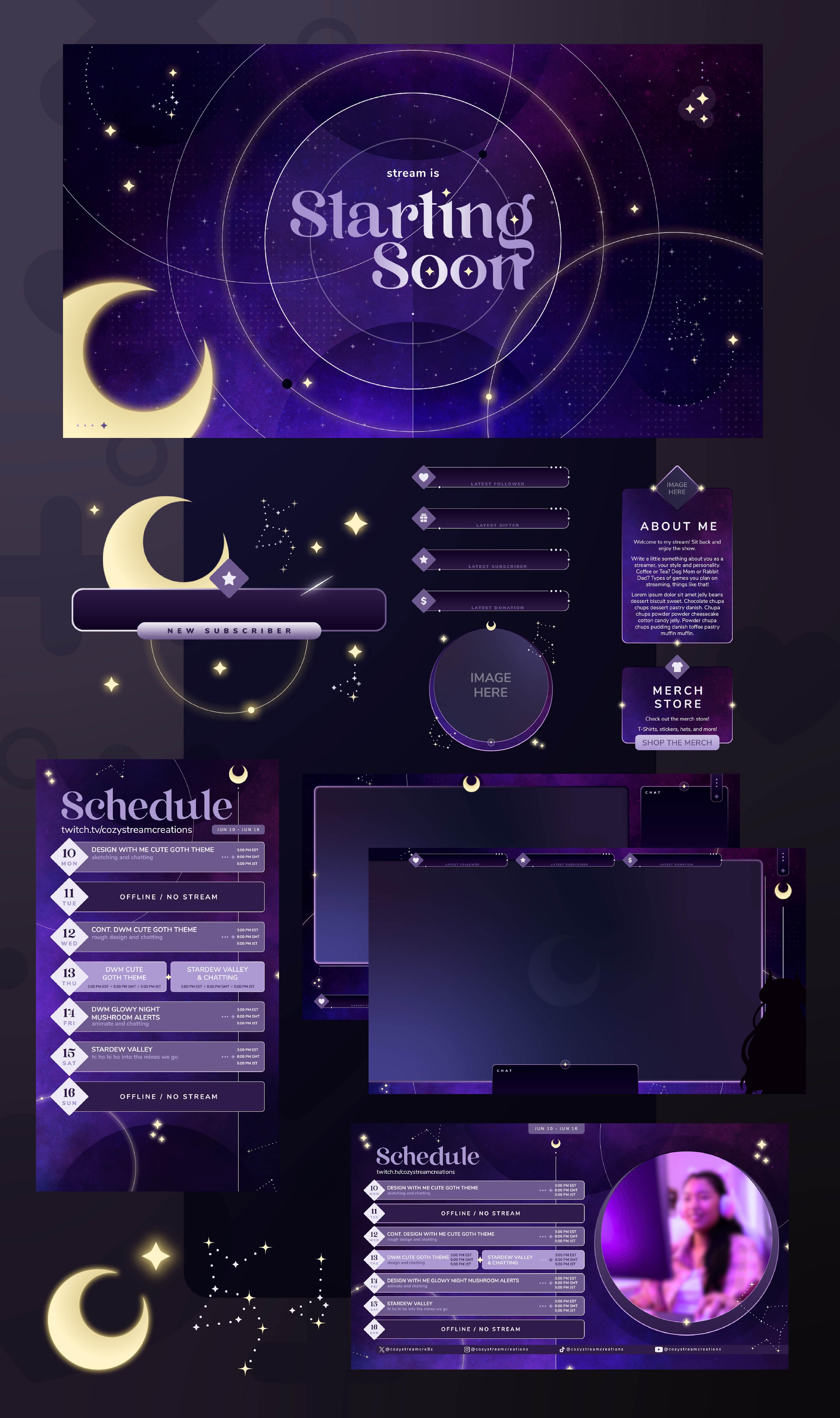 Cozy Stream Creations is an online shop I run, where I design and illustrate custom graphic assets for streamers to help them stand out. I also handle all aspects of marketing, from crafting campaigns to promoting my services and shop.